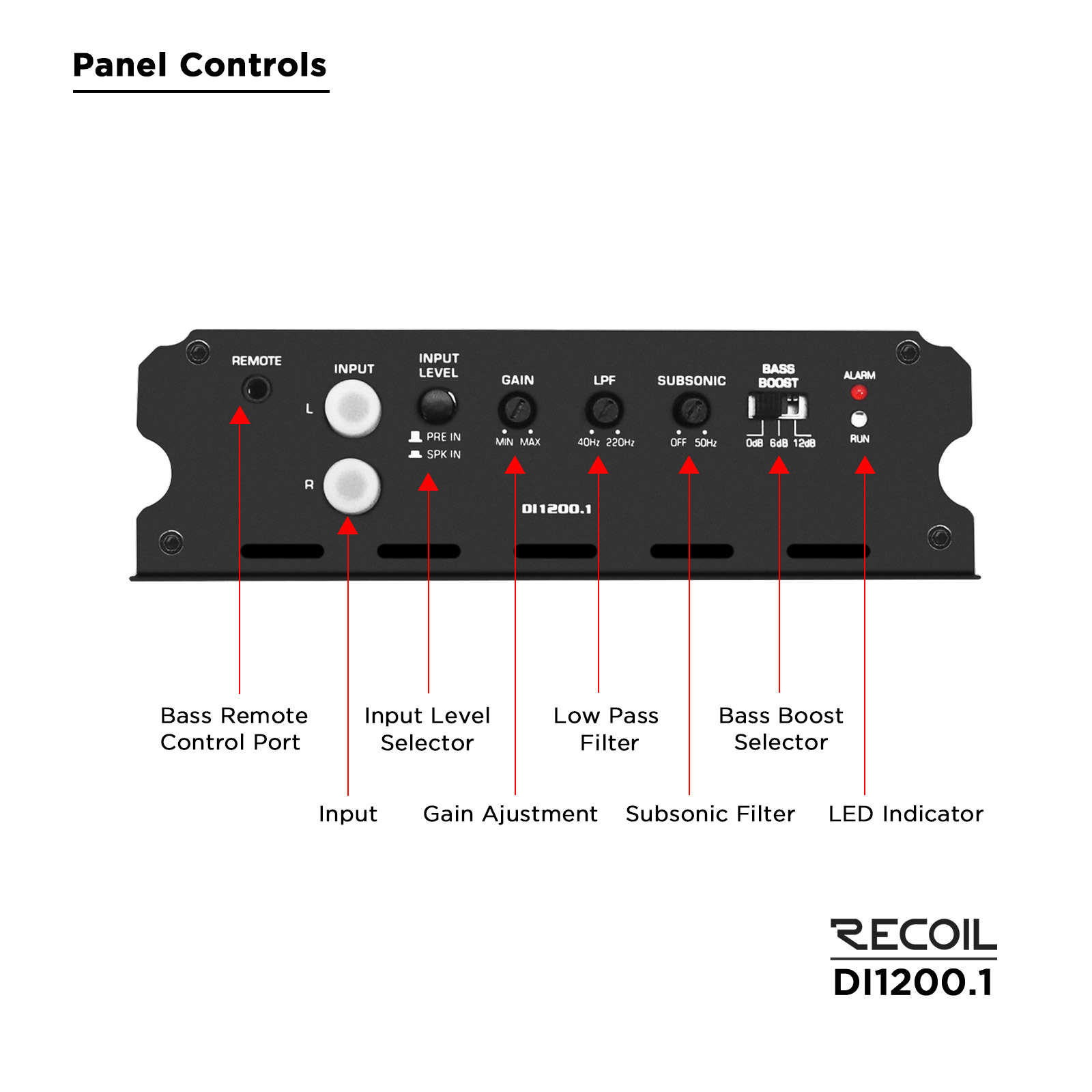 Recoil mono amplifiers come with bass remote control. Use it to customize your bass on the fly with just a turn of a knob.