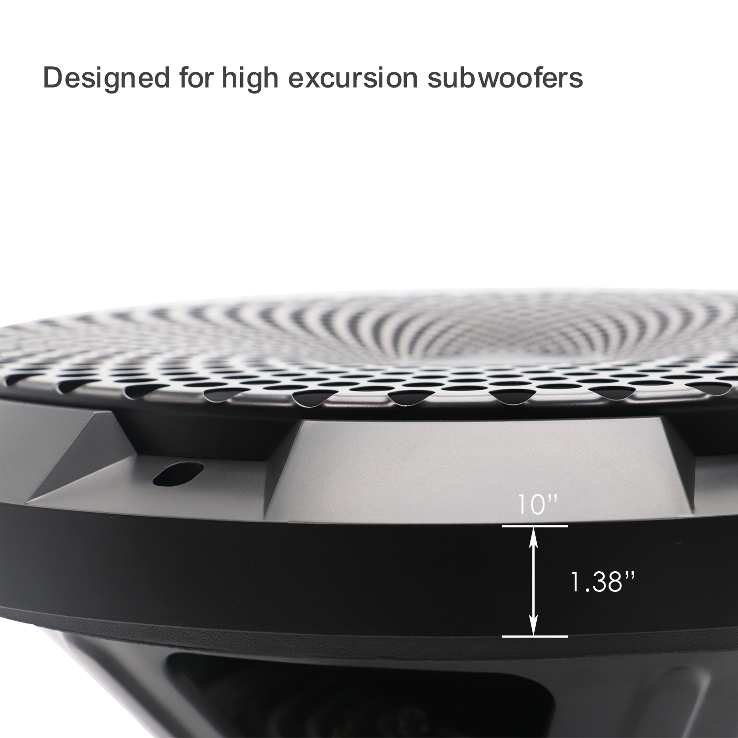 This 10″grille is made of heavy-duty deburring steel. It offers full protection against surround and cone damage, unlike other steel bar grilles. It keeps golf clubs, hockey sticks, or even baby strollers away from your subwoofers.
